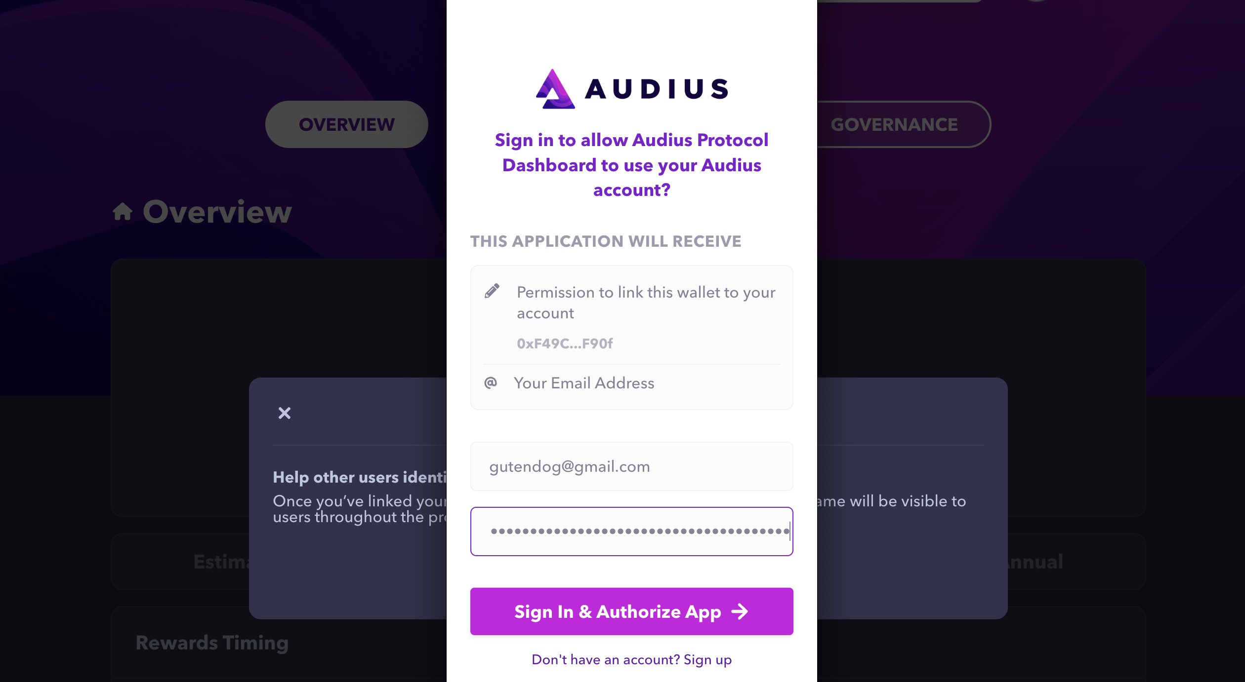 - In the pop over, enter the credentials of the Audius account you want to connect to your Protocol Dashboard account and click "Sign In & Authorize App"